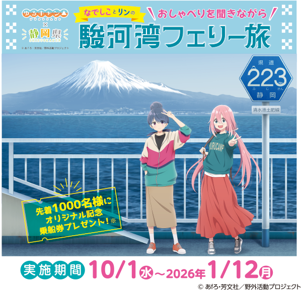 - TVアニメ『ゆるキャン△』の各務原なでしこと志摩リンが駿河湾フェリーに乗って伊豆キャンプへ